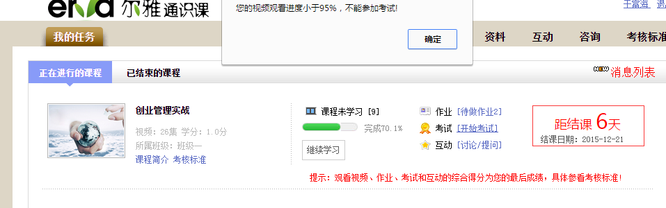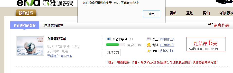 因未完成所有视频的学习,导致无法进行尔雅通识课的考试,特将三门尔雅通识课的学习时间延长一周,截止到12月21日。