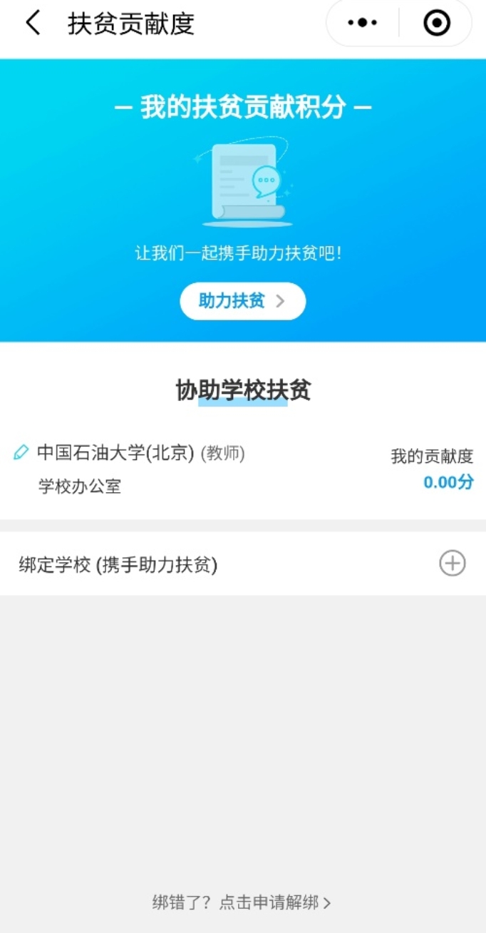 1.点击“我的”,进入个人中心页面,再次点击“我的扶贫贡献度”进入绑定页面。