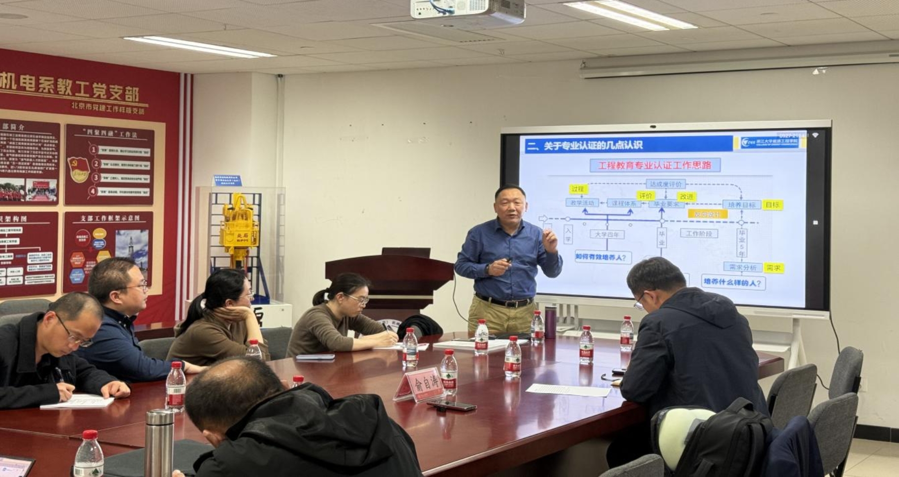 俞自涛教授首先介绍了工程教育认证的发展历程和现状,剖析了OBE理念,然后围绕认证的核心理念、认证标准7大模块和12条毕业要求展开详细解读。他从自身经验出发,详细介绍了自评报告中工程教育专业认证的关注重点,以及学生、培养目标、持续改进、毕业要求、课程体系等标准项的撰写重点及常见问题。最后,参会教师就自己对认证工作中的疑问和俞教授进行了深入的交流和讨论。