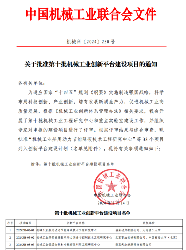 为顺应国家“十四五”规划《纲要》的要求,实施制造强国战略,科学规划科技与产业创新,推动机械工业实现高质量发展,中国机械工业联合会根据《机械工业创新体系管理办法》的相关规定,开展了第十批机械工业工程研究中心和重点实验室的评审工作。由北京石油机械有限公司(以下简称北石)和中国石油大学(北京)机械与储运工程学院(以下简称石油大学机械学院)共同申报的《机械工业深部资源钻采动力装备与控制技术工程研究中心》平台建设项目顺利通过评审,开展建设工作。