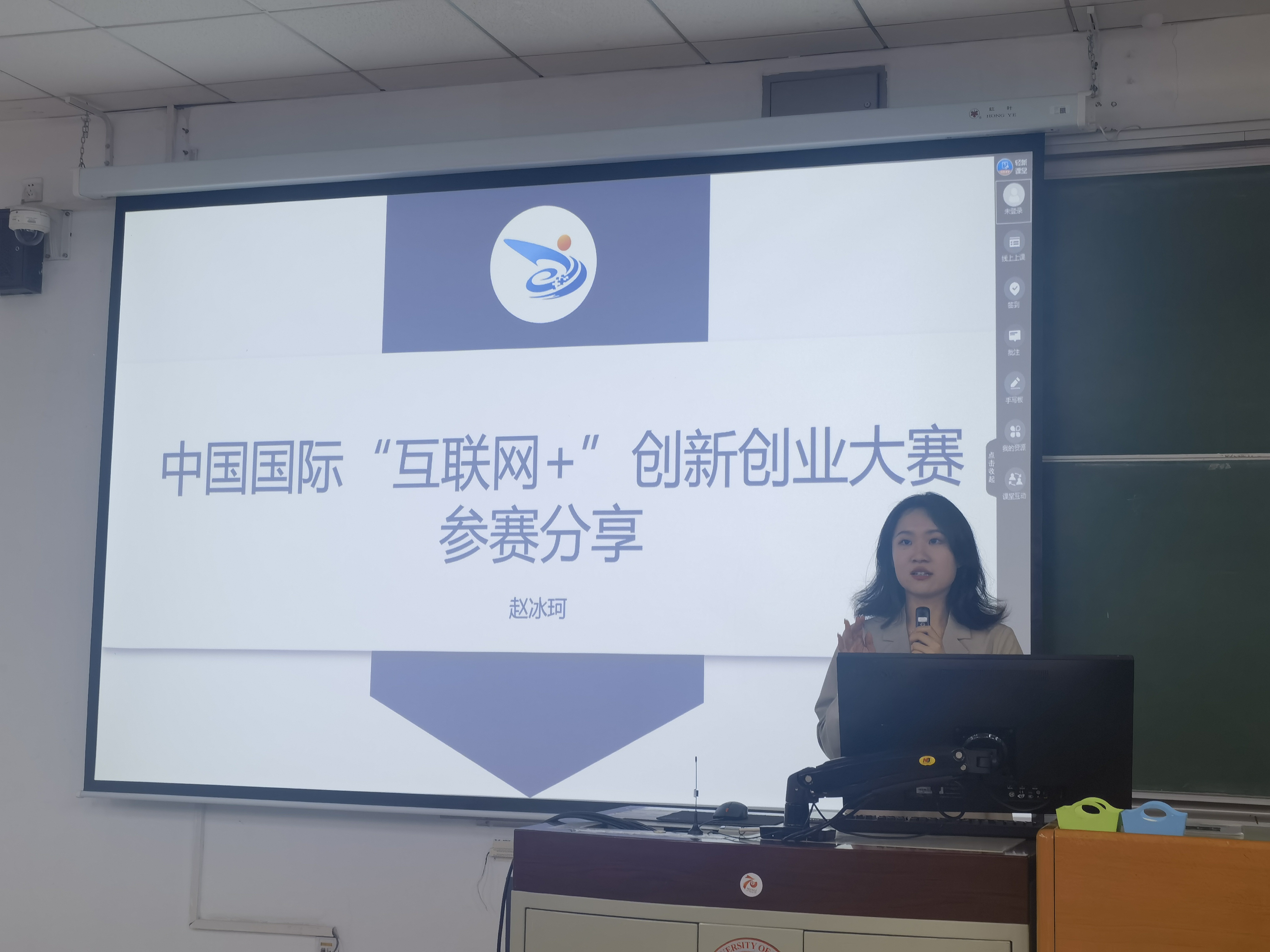 学院大四学生赵冰珂分享了自己获得第八届互联网+国家级金奖与中国国际大学生创新大赛(2023)国家级银奖的参赛经验,并逐页讲解参赛PPT的制作过程与细节,旨在提高同学们的作品提交质量。