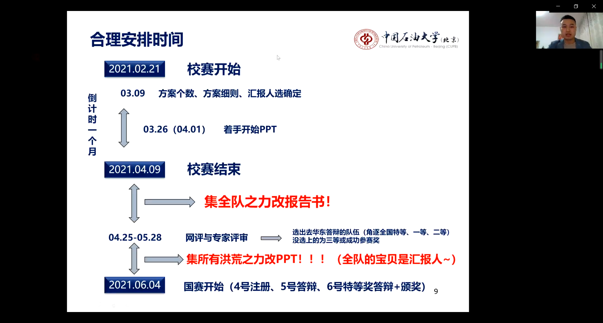 第六届全国大学生油气储运工程设计大赛校内选拔赛于2021年2月21日发布比赛通知,为培养学生解决工程实际问题的能力,加深对该比赛的整体理解。3月19日晚,机械与储运工程学院召开线上经验分享暨大赛指导会。储运系教师李晓平、油气储运工程专业博士研究生杨兆铭参加本次会议并做相关分享,辅导员穆野主持会议。