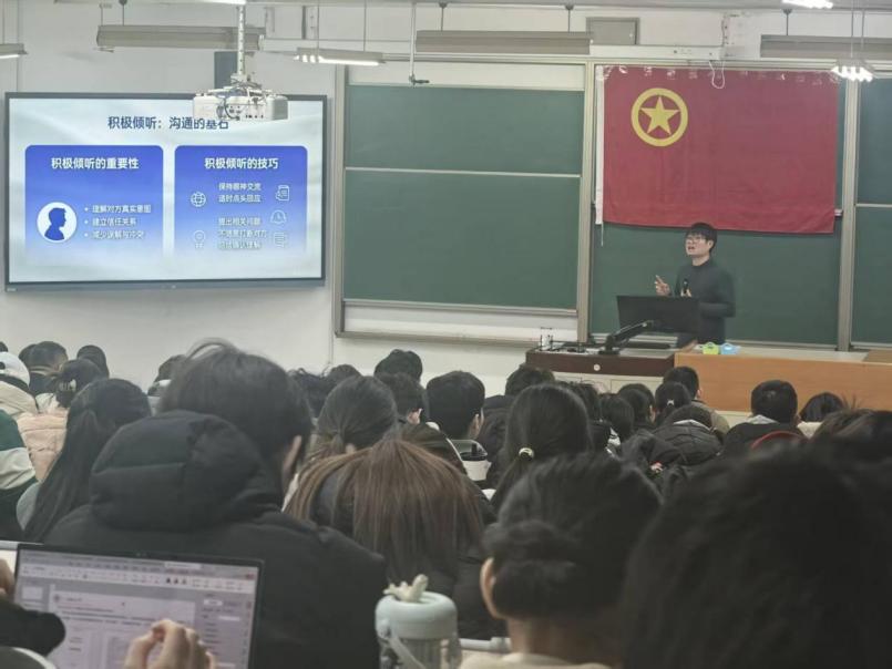 学院团委书记刘晔开展“沟通技巧能力提升”主题讲座。刘晔立足大学生学业发展、职业规划与个人成长的实际需求,系统拆解沟通基本模型,阐释有效沟通的四大原则,并围绕积极倾听技巧、沟通障碍应对策略、三明治反馈法则等内容,结合鲜活案例进行深入浅出的讲解,让抽象的理论知识转化为可落地的实操方法,学员们沉浸式学习,受益匪浅。