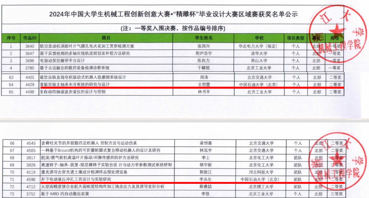 2024年5月23日,第七届中国大学生机械工程创新创意大赛·“精雕杯”毕业设计大赛获奖名单揭晓,中国石油大学(北京)学子在该赛事中斩获佳绩:由机械与储运工程学院特任岗位副教授王暾指导的“直驱顶驱主轴承水冷系统的研究与设计”(学生姓名:王恺霆)荣获北部赛区个人赛二等奖,副教授王文明指导的“井下电动液压冲孔工具设计与实验研究”(学生姓名:李永生、田树辉、张旭、姚鑫哲、刘志泽)荣获北部赛区团队赛二等奖。