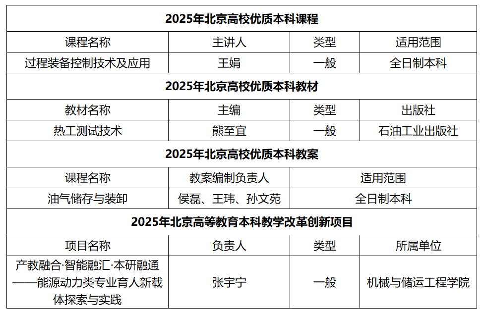 近日,北京市教育委员会公布了2025年北京高校本科教学项目建设评选结果,机械与储运工程学院4项成果入选,其中优质本科课程、优质本科教材、优质本科教案、本科教学改革创新项目各1项。