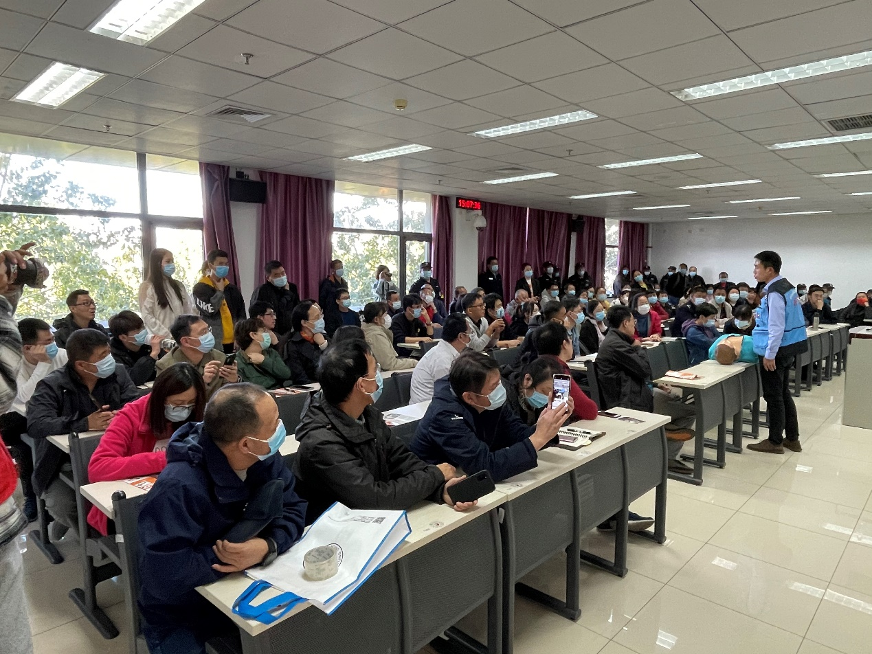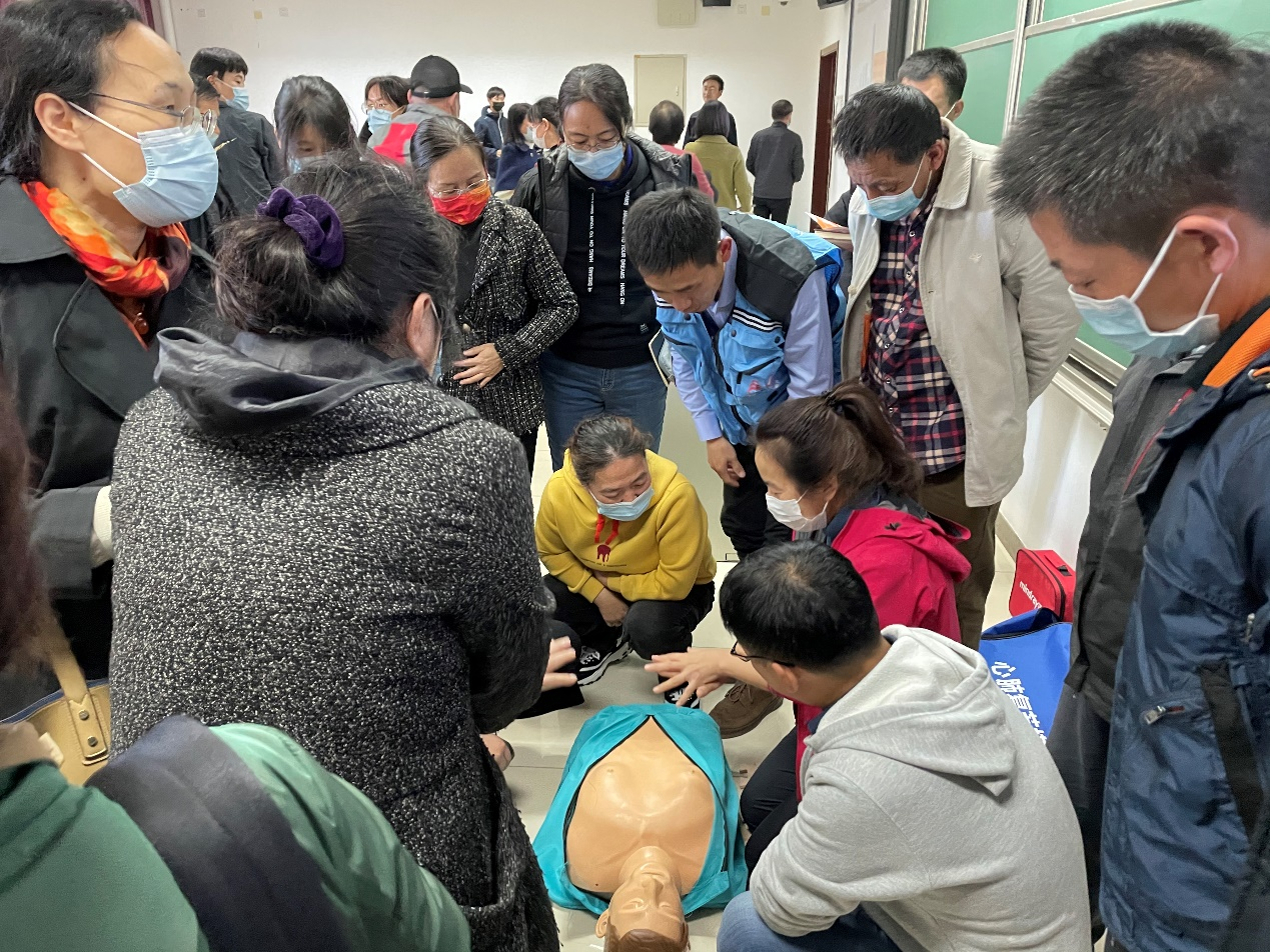 宣教讲师王芳伟详细讲解了海姆立克法、心肺复苏要领和AED设备的使用方法,借助仿真模拟假人及AED教学设备进行现场演示,手把手进行实操体验教学。