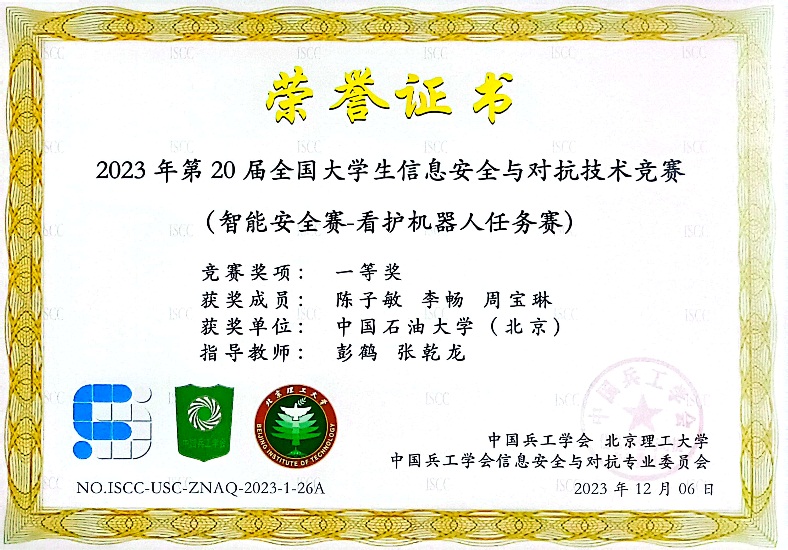近日,第20届全国大学生信息安全与对抗技术竞赛(ISCC2023)“智能安全赛”在北京理工大学落下帷幕。我校机器人双创实验室师生积极组队报名,由机械与储运工程学院彭鹤和张乾龙两位老师指导,本科生陈子敏、周宝琳、李畅、丁彬、袁思扬参加了该赛道的看护机器人和安全驾驶两个赛项,克服备赛时间短、缺少调试场地等重重困难,最终斩获全国一等奖1项,全国二等奖2项。