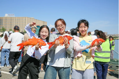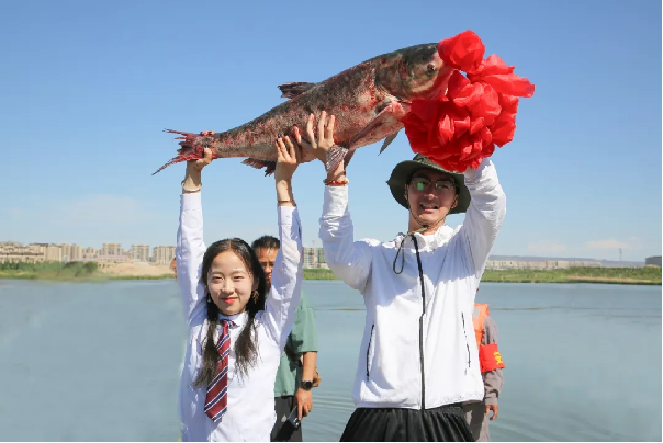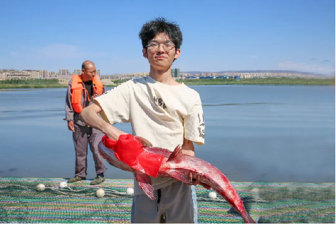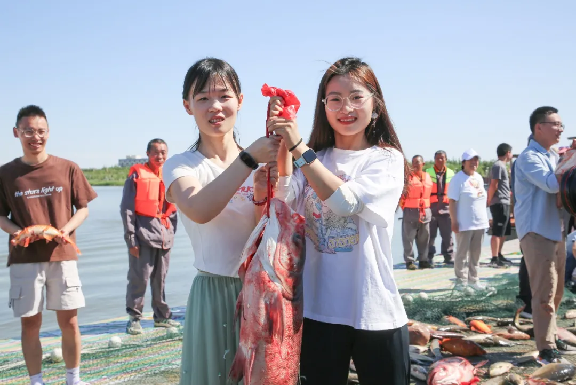 “一、二、三,拉!”6月2日,中国石油大学(北京)克拉玛依校区红山湖畔,伴随着响亮的口号,师生齐上阵收紧渔网,一条条大鱼翻腾着跃出水面。随着最后一网鱼上岸,师生们纷纷涌上前,在忙着把鱼装箱的同时,还不忘抱起“头鱼”合影留念。现场一片欢腾。