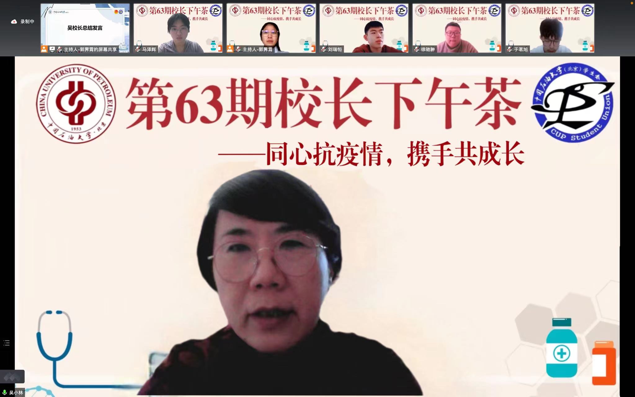 “如何做好个人防护?”“面对疫情青年学生能做些什么?”随着国家疫情防控措施的不断优化、防控科学精准水平不断提升,高校疫情防控工作也进入了新阶段。12月18日,第63期校长下午茶——“同心抗疫情,携手共成长”活动于线上如期举行,中国石油大学(北京)校长吴小林与14名学生代表以下午茶的形式共同分享了整个抗疫过程的感受和思考,共同探讨了青年的责任与担当话题。
