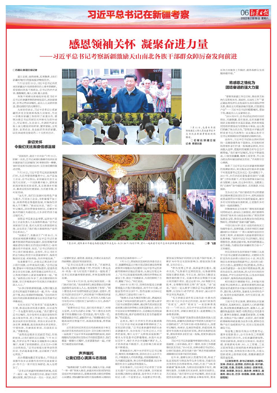 7月12日至15日,习近平总书记再次来到新疆这片他深情牵挂的土地考察调研,看望慰问各族干部群众。总书记的声声话语、殷殷嘱托,暖人心田、催人奋进。