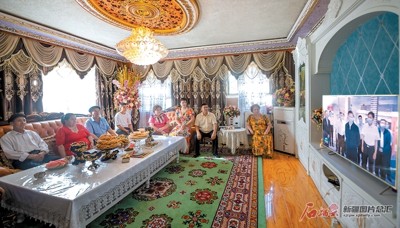 7月15日,尉犁县兴平镇达西村村民阿不力克木·木沙(右二)与村干部、家人一起收看习近平总书记在新疆考察的新闻报道。李飞摄