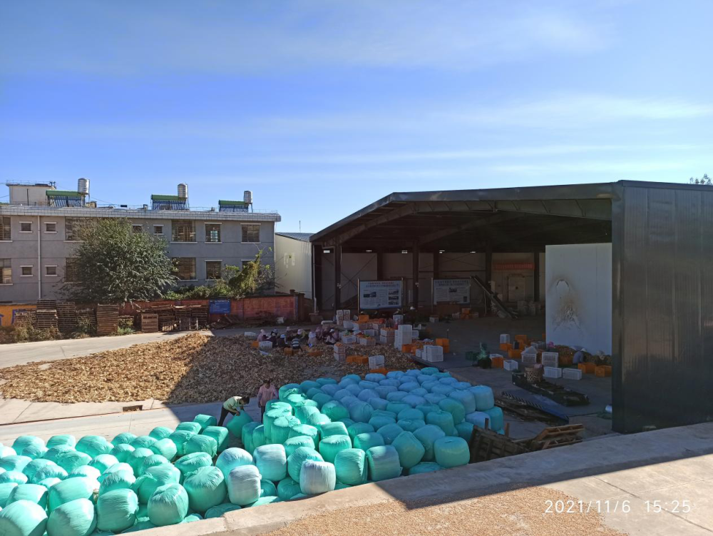 务工人员在打包秸秆碎屑。(11月6日摄)
