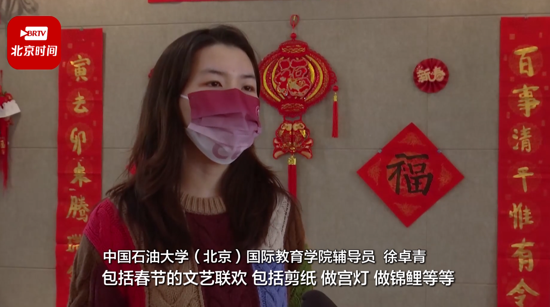 昌平区融媒体中心的新闻短片《昌平:新春文化活动丰富多彩、亮点纷呈》于1月23日(大年初二)8:20北京广播电视台《北京时间》中播出。短片展示了昌平区各地的春节活动,中石大国际学生在春节文艺联欢、剪纸、写春联、写福字、做灯笼等活动中感受中国的年味,感受北京的年味。