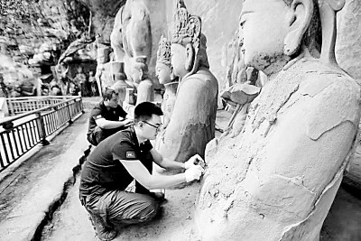2019年6月29日,重庆市大足石刻景区,修复人员正在对造像进行超声波检测。黄舒摄/光明图片