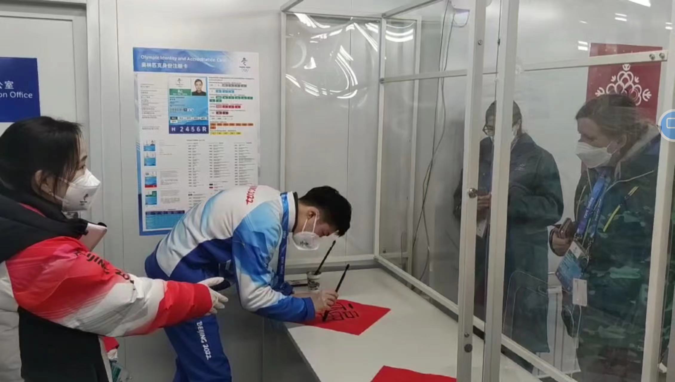 姜华瑀还记得,除夕当晚,延庆冬奥村注册中心灯火通明,两位澳大利亚代表团成员正在等候区等待班车,注册领域副经理刘紫薇提议给身在异国的她们送上“中国福”。那天在岗的就有姜华瑀,他为外国友人写了两个“福”字,并解释了福字的寓意以及贴法。