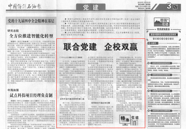 两个月前,经过持续深入的沟通,一项由双方党支部书记共同签订的《支部共建协议书》在渤海油田落地生根。校企双方以党建共建为基础和纽带,打通了支部间合作建设的任督二脉。