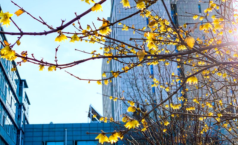 中国石油大学(北京) 青年园公寓前的连翘花迎风起舞(张姣/摄)
