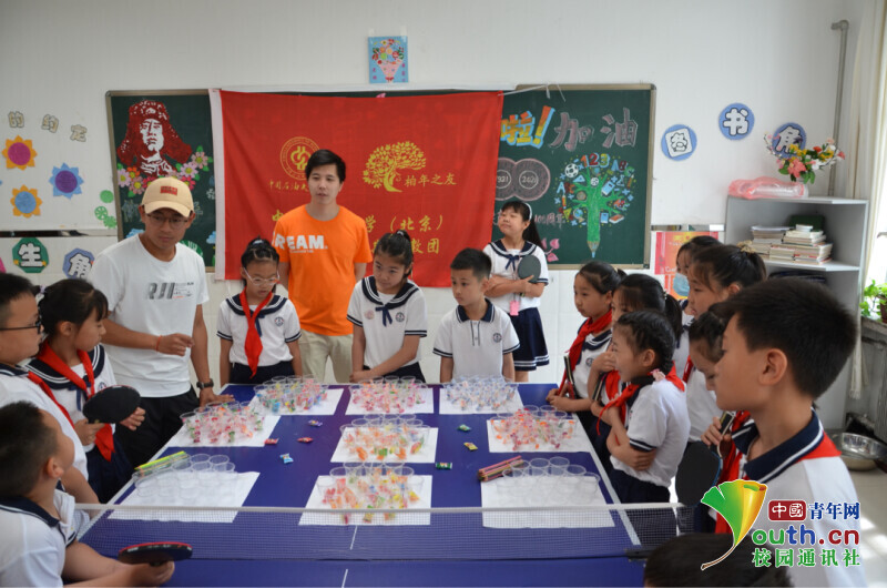 图为趣味乒乓球课,志愿者正在为同学们讲解游戏规则,旗帜旁曾经学过乒乓球的小女孩露出信心十足的表情。中国青年网通讯员 何天 供图