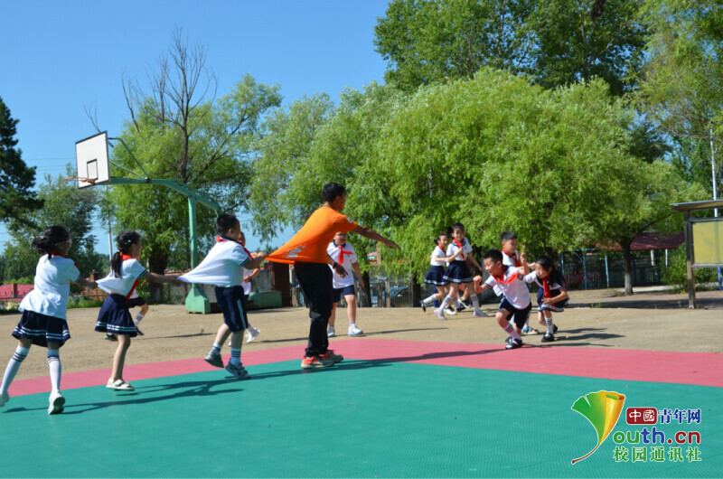 图为趣味运动会,志愿者们带领小朋友们走出课堂,开展了一系列趣味游戏活动,通过“老鹰捉小鸡”“击鼓传花”“老狼、老狼几点了”等游戏,志愿者们与同学们打成一片,玩得不亦乐乎。中国青年网通讯员 何天 供图