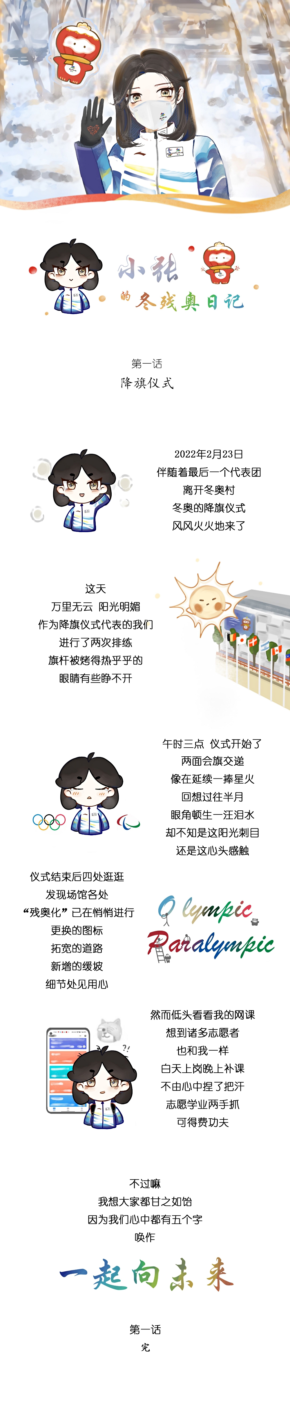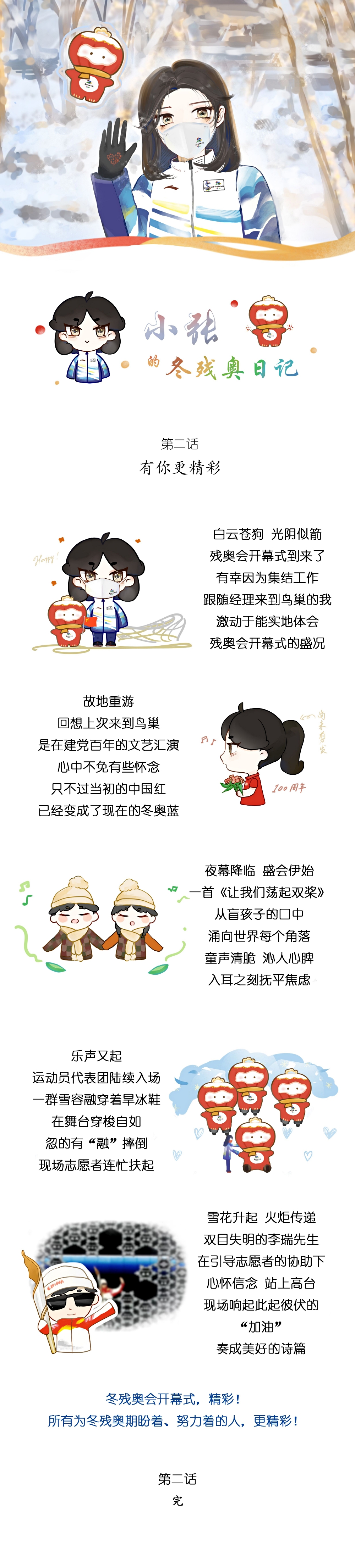 如今冬残奥会闭幕在即,也意味着我为时两个月的志愿服务要接近尾声。虽然有些念念不舍,但是一想到未来的某个时刻,会有人和我一起看着《小张的冬奥与冬残奥日记》,回忆起这段宝贵的时光,报以浅浅一笑,就觉得心头温暖,也没有那么惧怕离别了。