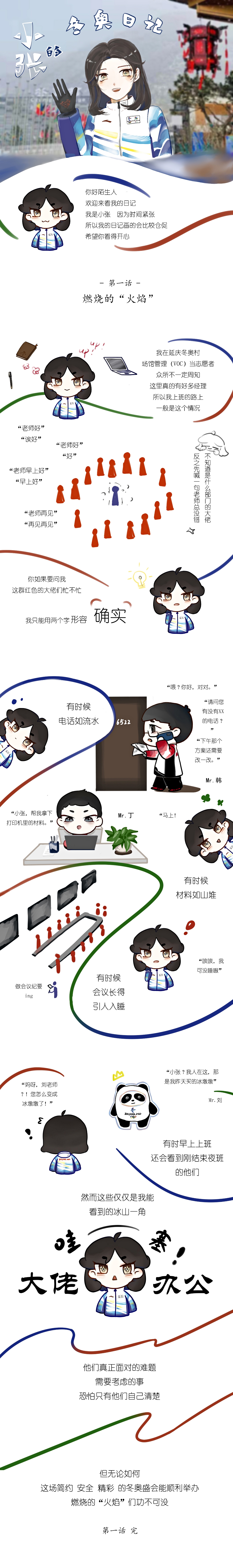 熬夜开会的经理,井然有序的志愿者,默默无闻的幕后工作人员,偶遇的友善运动员……我把我在冬奥与冬残奥会志愿服务期间的经历用我的画笔重现出来,第一话的绘制充满了探索,但第一话之后,第二、第三话的绘制越发的顺利。本着“精益求精”的想法,每新的一话,我都会尝试新方法去改善画面,而每一次的绘制,也让我对我的绘图软件越来越熟悉。