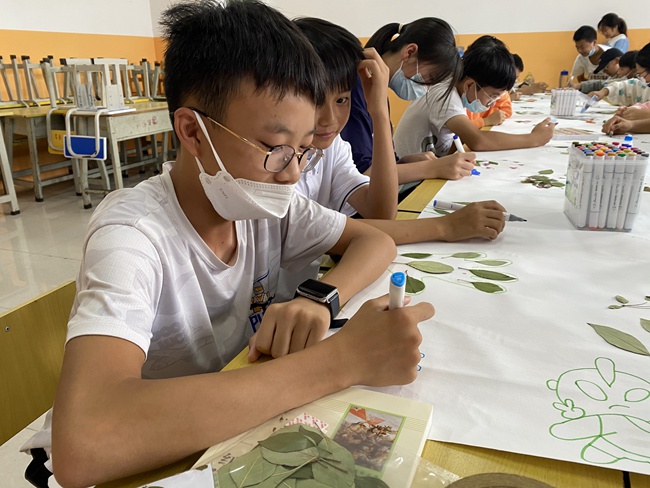 “希望能通过这盏灯,让北京和南华的海棠融为一体,也希望这盏灯可以点亮更多孩子的梦想。”实践团成员张可莹说。做完海棠小夜灯后,实践团成员杨祉桢又和孩子们一起,将剩余的树叶配以画笔和颜料,共同完成了一幅长达6米的绿色生态画卷,将这份如诗意一般的温暖镌刻在南华大地。