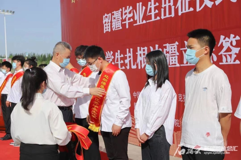 留疆毕业生出征仪式现场,毕业生代表签名,表达扎根边疆的决心。通讯员 魏静怡摄