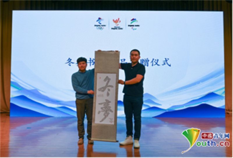 金先赤在中国石油大学(北京)2022年北京冬奥会和冬残奥会志愿者倒计时50天誓师大会上将《冬梦》书法作品捐赠给石油大学全体志愿者