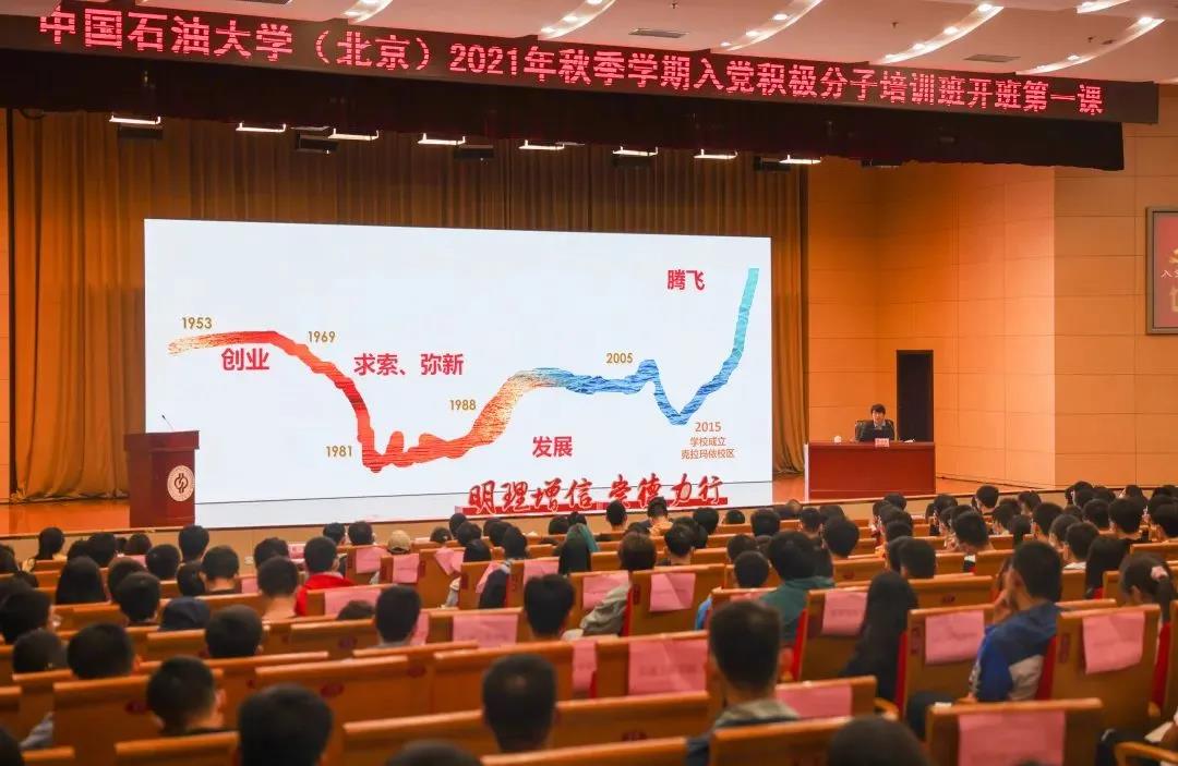 为持续推进党史学习教育走深走实,切实加强新形势下学校入党积极分子的教育培养工作,引导广大积极分子认真学习新时代党的创新理论,深化对党史、校史的认识,坚定政治信仰,端正入党动机,10月14日下午,中国石油大学(北京)校长吴小林以“敢立潮头,行稳致远:中石大新青年当以能源报国呼应时代脉动”为题,为2021年秋季学期入党积极分子培训班上开班第一课,本次党课也是校本部和克拉玛依校区入党积极分子第一次同上一堂党课。党委副书记雷玉江主持党课学习。