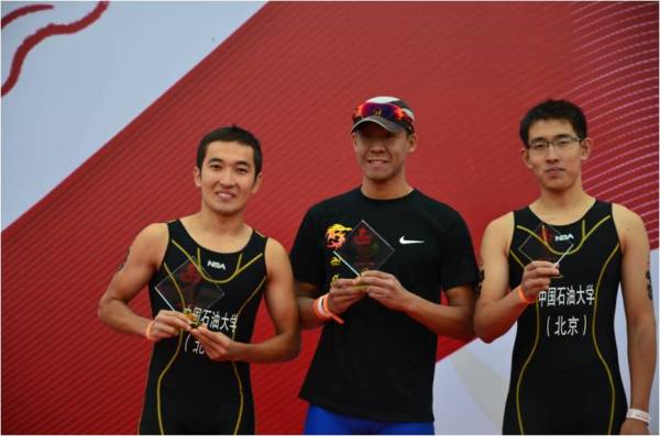 石大铁人三项代表队由8名学生和来自成人及远程教育学院的4位教师组成,此前进行了暑期集训,他们在比赛中顽强拼搏,最终,地球科学学院2013级硕士研究生叶尔加那提•包拉提、化学工程学院2011级本科生邢运亮分别获得男子奥运会标准距离20~24岁组第一名和第三名;石油工程学院2012级本科生锁钟楠、化学工程学院2013级本科生张庆森、机械与储运工程学院2012级本科生唐幸炎包揽了男子短距离20~24岁组前三名,化学工程学院2012级本科生胥吉海和机械与储运工程学院博士研究生于阳则分别获得该组第六名和第七名;成人及远程教育学院教师解放、荣鹏宇、魏文亮获得接力比赛第六名;成人及远程教育学院教师周泽天获得了男子奥运会标准距离25~29岁组第十一名。同时,叶尔加那提•包拉提作为参赛选手代表参加了本次比赛的宣传海报拍摄。