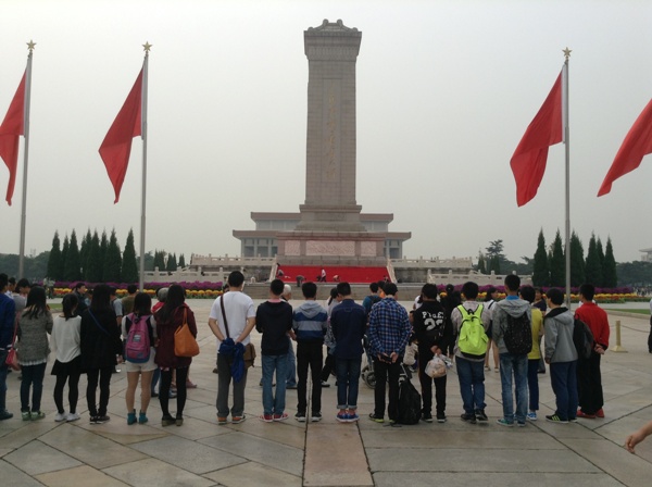 清晨,全体成员来到了天安门广场,先后瞻仰了毛主席纪念堂和人民英雄纪念碑。在毛主席纪念堂,同学们缓将手里的菊花肃穆地摆放在纪念堂前。在人民英雄纪念碑前,党支部成员站成一列默哀,缅怀那些逝去的人民英雄,并向他们表达了敬意。