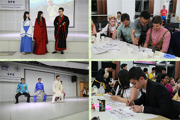 23日晚,SPE文化之夜在学生活动中心报告厅举办。各国代表表演了具有本国特色的舞蹈、音乐等节目,石大SPE分会学生向各国参赛选手展示了太极、汉服等中国传统文化,一同学习戏剧脸谱、风筝绘制和汉字书写,观看了糖画、花鸟字等中国民间艺术的制作。活动氛围轻松自由,促进了各国文化交流。