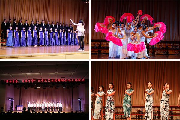 在民乐·朗诵专场中,民乐团演奏了《光明行》《闯将令》《旱天雷》等传统器乐合奏,以及由团员们编排的《奇迹》《欢沁》《龙猫》等现代风格的乐曲,让在场师生感受了浓浓的民族韵味;朗诵团带来了精心准备的《我们的祖先叫炎黄》《山河恋》《归来》等节目,用声音的魅力感染着在场的每一位观众。舞蹈·合唱专场中,舞蹈团带来了《金陵十三钗》《雨中花》等大型群舞和一段改编自电影《红高粱》的独舞《九儿》,给观众呈现了一场视觉盛宴;合唱团带来了大合唱《雪花》《哆来咪》,用阿卡贝拉的演绎形式表演了《平凡之路》和《lolipop》,欢乐的歌声博得了观众的阵阵掌声。街舞专场中,街舞社的学生们展示了Poppin、Hiphop、Locking和Breaking四种类型的街舞表演,劲爆的音乐和高难度的动作让现场动感十足。在管弦乐团专场演出中,管乐团演奏了经典电影主题曲《美女与野兽》《Let it go》《银城争霸》;弦乐团携手管乐团带来了《第一交响曲》《肖斯塔科维奇第二圆舞曲》等经典曲目,为石大师生送上了一场高水平的音乐会。在艺术展演闭幕式暨话剧专场演出中,话剧团表演了经典话剧《暗恋桃花源》,环环相扣的剧情和精湛的演技,展现了石大学子的舞台表现力。