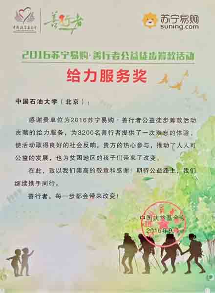 9月10日至11日,由中国扶贫基金会、昌平区人民政府联合举办的2016善行者公益徒步活动在北京市昌平区举行。中国石油大学459名志愿者全程参与并完成此次活动的颁奖、补给、义卖、引导等志愿服务工作,累计志愿服务时长超过6000小时,服务参赛人员超过3000人次。随后,主办方为活动中做出突出贡献的爱心企业、爱心媒体、志愿者团队分别进行了表彰,石大志愿者团队荣获2016善行者公益徒步活动“给力服务奖”。