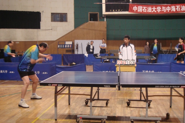 10月22日下午5点,由我校教职工兵乓球协会组织,校工会,校学生乒乓球队协办的“中国石油大学与中海石油乒乓球友谊赛”在我校多功能厅举行。