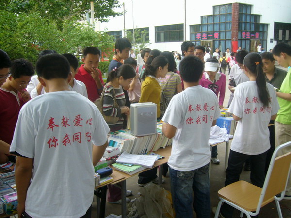 由学生工作处主办、物品捐赠中心具体实施的“支援灾区,温暖中国”大型爱心义卖活动今天下午6:00在一餐门前落下帷幕。此次活动分为“物品捐赠”和“爱心义卖”两个部分,不接受钱款捐赠,以书本及生活用品为主,5月29日、30日在学校一餐、润杰、阳光公寓举行了捐赠活动,所捐物品主要有衣服、书本、杂志、电子产品、笔、笔芯、磁带、水杯等。义卖时间是6月1日、2日,分别在润杰西门和学校一餐门前举行。