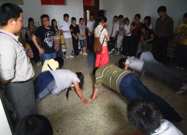 随着207、208教室《我相信》歌曲的响起,活动正式开始。每个教室的主持人先向同学们介绍了扩展活动的历史与意义,并激发起同学们参加活动的热情,随后将同学分为16个团队,让同学们自己进行了团队建设。在南门小广场,拓展师带领同学开展进行了盲眼和电网两个室外项目。在第二教学楼中,同学们进行了领袖风采的活动环节。