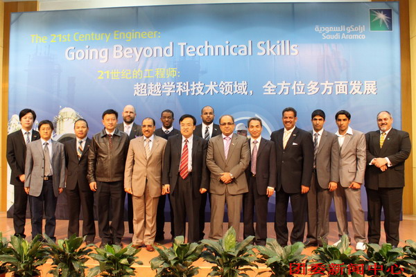 10月19日晚7:00,沙特阿美公司副总裁卡里德•阿布杜拉•布莱克先生应邀作客我校阳光讲坛,在翠宫报告厅作了主题为“21世纪的工程师:超越科学技术领域,全方位多方面发展”的学术报告。校长张来斌出席报告会并与客人合影。