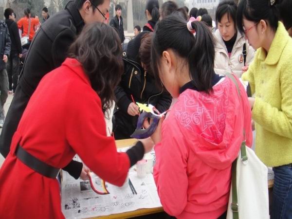 29日中午,工作人员身上的自画T恤衫,集创意与灵感于一体的新奇海报和栩栩如生的“囧一家人”纸盒模型等,都引得同学们驻足观看,并亲自动手制作出属于自己的创意作品。同学们在主办方提供的T恤衫、孔明灯、面具等材料上涂鸦心情,写下祝福。各种可爱的卡通造型、创意制作都表达着同学们对世博会的期盼与祝福。此外,活动吸引了我校徐端午教授的目光,徐教授以一幅写意的山水画表达了对活动的支持,赢得了同学们阵阵喝彩。