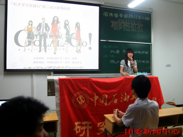 5月9日晚,中国石油大学“石大学子实践行第二站”活动在二教109室精彩展开。活动由中国石油大学(北京)团委主办,中国石油大学(北京)研究生会承办。本次实践行是以放映电影《杜拉拉升职记》为载体,旨在向即将踏入社会的石大学子们展现丰富多样的职场生活并宣传白领们的奋斗精神。