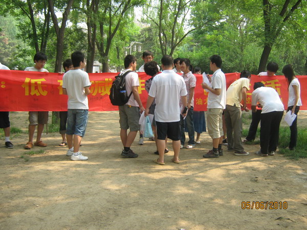 为响应2010年世界环境日·中国“低碳减排·绿色生活”这一主题,使更多人成为环境保护的宣传者、实践者和推动者, 6月5日上午,中国石油大学化学工程学院部分学生在昌平公园举办“世界环境日”主题宣传活动。