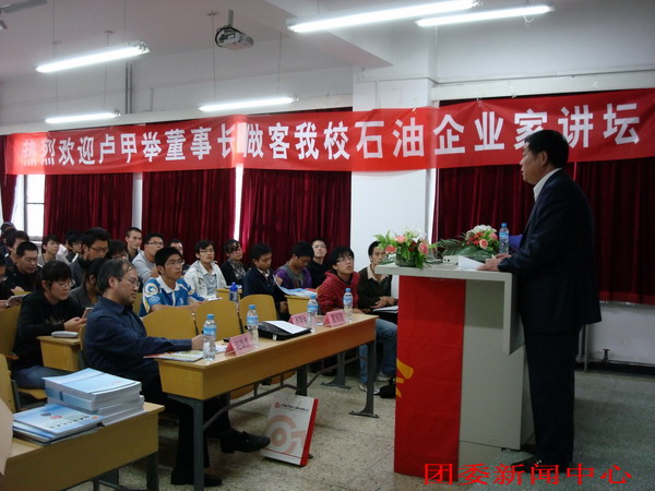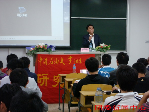 座谈会上,卢甲举先生先简要介绍了北京奥凯立科技发展有限公司在油田化学品科技创新上的主要成就及发展现状,接着重点讲述了自己的创业奋斗史。凭借着“敢为人先”的进取精神和“借科技发展助企业发展”的经营理念,卢先生从白手起家创业到90年代初的企业年产值达300万元,年利税50万元;从公司成立初期的没有产品到目前拥有自主开发的5个系列120多个品种,并成为目前国内生产油田固井外加剂品种最多、销售量较大、技术含量较高的石化企业。与此同时,卢先生也将他的情怀融入诗歌创作中来,创作了不少诗歌作品。然而这一切都离不开坚持和拼搏。他告诫同学们,成功是需要不懈的努力和创新的,人生中充满着奇迹,而创造奇迹的人,一定要有着宽广的胸怀和远大的志向。要不断追求知识,丰富自己,要学会将课本与实践相结合,做到“会用,能用,善用”的三用标准。最后,卢甲举先生就同学们关于自主创业以及目前就业形式等问题进行了细致的回答。