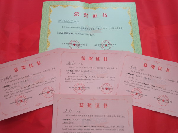 6月17日从全国大学生英语竞赛组委会传来喜讯,中国石油大学学生在2011年全国大学生英语竞赛(NECCS ,National English Contest for College Students)中取得优异成绩,经过初赛、复赛两轮激烈角逐和专家评阅,共有110名同学获得国家级奖励,其中4位同学荣获全国特等奖,9位同学获得全国一等奖。