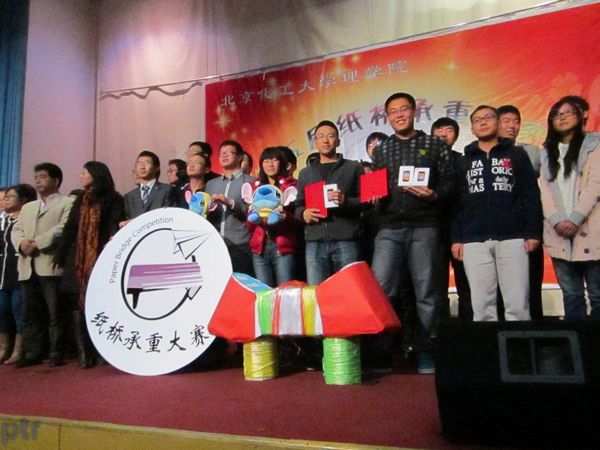 决赛场上,比赛环节异常热烈,最终来自中国石油大学的国天石、陈航、马晓旭三位同学精心制作的纸桥以承重56.5kg的成绩刷新了记录,获得了本次大赛的总冠军。石大学生以优异的成绩包揽了前三名。北京化工大学理学院教授孟庆云、院党委副书记郑秀英为获奖队员颁奖。