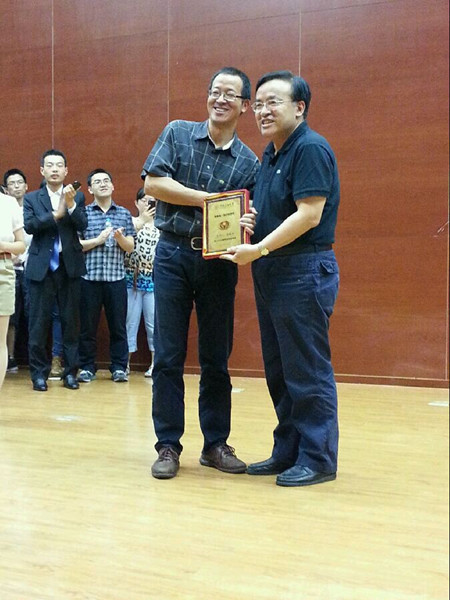 演讲结束后,张来斌代表学校向俞敏洪赠送了阳光讲坛纪念章,俞敏洪在阳光讲坛主讲人纪念册上签名留念。