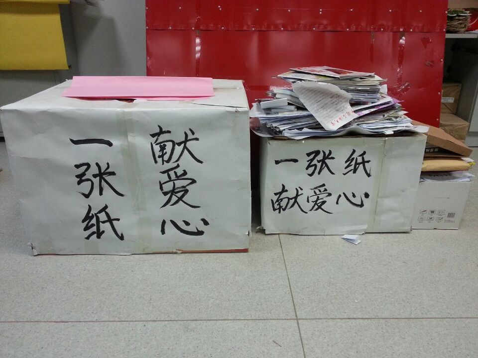 活动中,志愿者分别在三教大厅和学生活动中心一楼放置大纸箱,鼓励大家把用过的废纸、草稿纸、报纸杂志等捐献出来,用捐献废纸的形式变废为宝,支持慈善事业,将慈善行为平凡化、日常化、生活化。