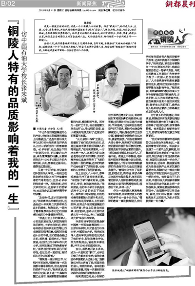 9月11日,铜陵日报铜都晨刊在第2版刊登了专访中国石油大学校长张来斌的文章《“铜陵人特有的品质影响着我的一生”》。