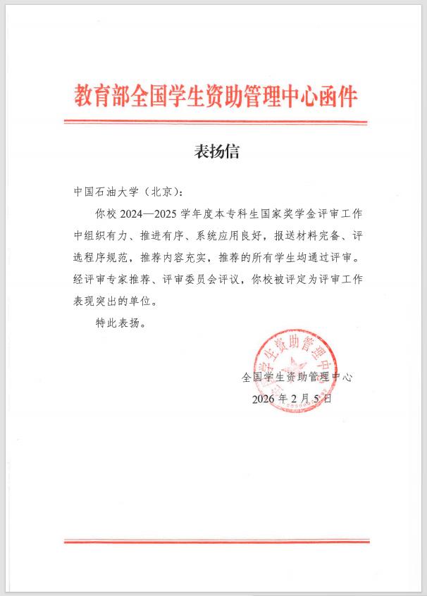 信中指出,中石大在2024-2025学年国家奖学金评审工作中组织有力、推进有序、系统应用良好,报送材料完备、评选程序规范,推荐内容充实,推荐的所有学生均通过评审,经评审专家推荐、评审委员会评议,学校被评定为评审工作表现突出的单位。