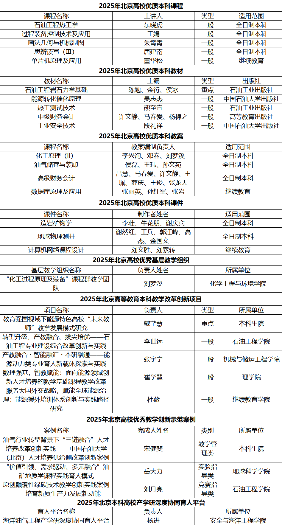 近日,北京市教育委员会公布了2025年北京高校本科教学项目建设评选结果,中石大27项成果入选,其中优质本科课程5项、优质本科教材5项(含重点1项)、优质本科教案4项、优质本科课件3项、优秀基层教学组织1项、本科教学改革创新项目5项(含重点1项)、优秀教学创新示范案例3项、产学研深度协同育人平台1项。