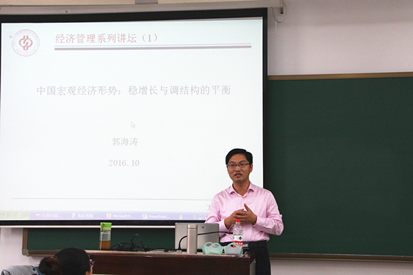 10月19日,石大工商管理学院在三教409室举办经济管理系列讲座。工商管理学院院长郭海涛以“中国宏观经济形势:稳增长与调结构的平衡”为题作了讲座,共二十余名师生参加。
